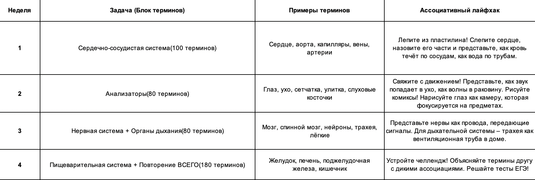 - Отработанные мнемотехники для сложных блоков (анатомия, ботаника).
